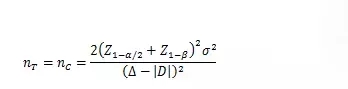 以下公式中,nT、nC分別為試驗(yàn)組和對照組的樣本量;Z1-α/2、Z1-β為標(biāo)準(zhǔn)正態(tài)分布的分?jǐn)?shù)位,當(dāng)α=0.05時(shí),Z1-α/2=1.96,當(dāng)β=0.2時(shí),Z1-β=0.842;(Z1-α/2+Z1-β2=7.85