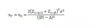 以下公式中,nT、nC分別為試驗(yàn)組和對照組的樣本量;Z1-α/2、Z1-β為標(biāo)準(zhǔn)正態(tài)分布的分?jǐn)?shù)位,當(dāng)α=0.05時(shí),Z1-α/2=1.96,當(dāng)β=0.2時(shí),Z1-β=0.842;(Z1-α/2+Z1-β2=7.85